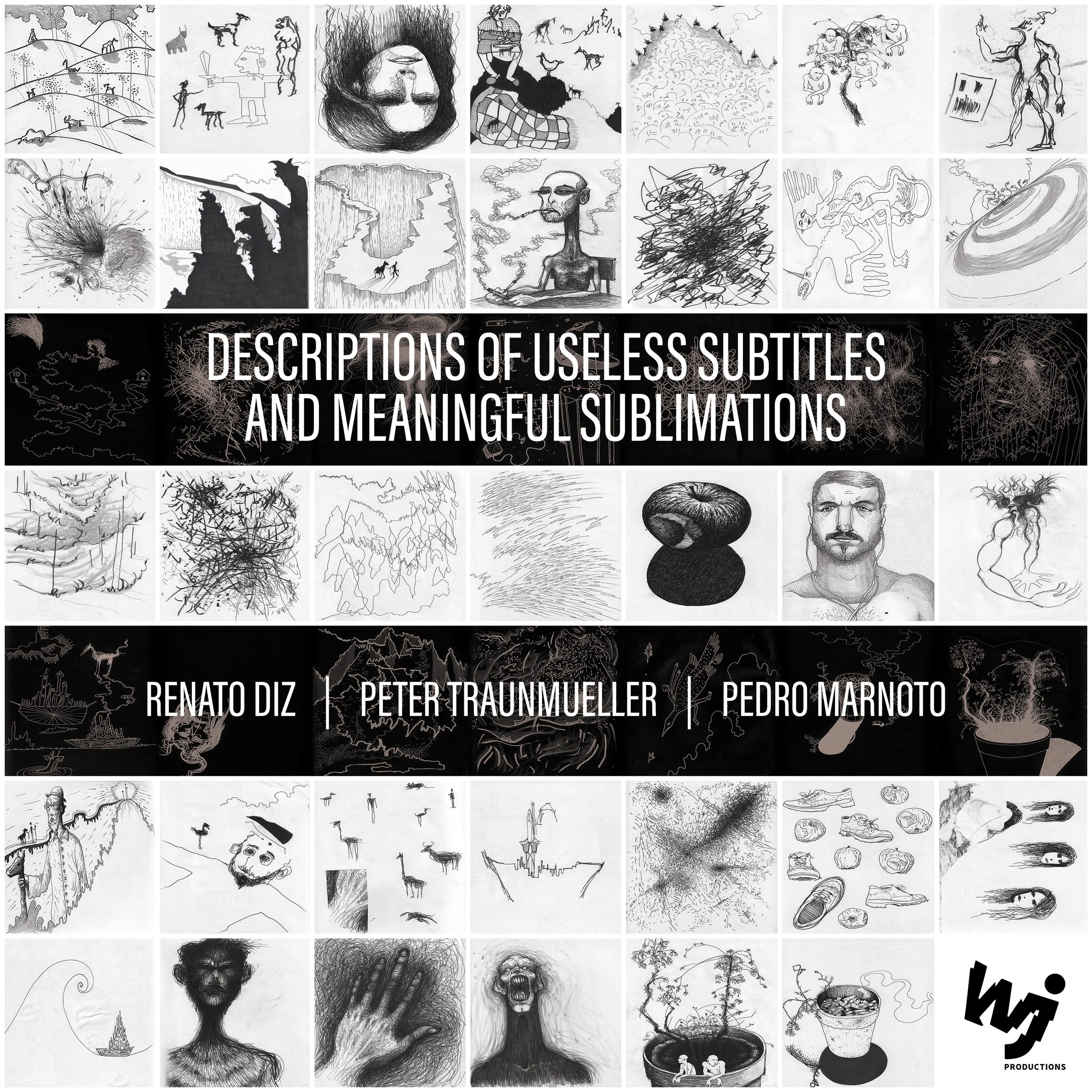 DESCRIPTIONS OF USELESS SUBTITLES AND MEANINGFUL SUBLIMATIONS is a multi-sensorial living ecosystem comprised of 13 interdependent organisms. Each organism contains three biotic components: a musical soundscape, a poem, and a visual artwork. As with any ecosystem, you are free to travel through its topography, form associations between the different components inside each organism, and create personal meanings. Each component is a distinctive being, and each organism (sound+poem+artwork) a self-contained world. At any point, you can zoom in on a particular component and focus on details that catch your attention. Every viewing and/or listening will generate multiple interpretations, resulting in a dynamic, immersive experience that invites numerous dialogic relationships between art(ist) and the audience.This project was initially born out of a need to document the telepathic musical connection between Renato Diz and Peter Traunmueller. An irresistible Darwinian impulse to diversify led to the inclusion of José Diogo Neves, who oversaw the recording sessions and mixed & mastered every sonic event into audiophilic perfection. All tracks were created using a keyboard and a drum set exclusively, and recorded in real time with no interruptions - no repeated takes, overdubs, or post-production artificialities. José’s mixes unearthed new strata of poetic and cinematic dimensions in the sound, inspiring Renato and Peter to respond with automatic-writing poems. These poems were edited and combined during music listening sessions under pandemic-era restrictions (videoconference). The combination of sound and poetry suggested entirely new visual universes, and Pedro Marnoto was invited to bring them to life. Immersed in the music and poetry, Pedro drew away, then teamed up with Renato to combine the sketches into dynamic black-and-white compositions. From the genesis through the conception of each component, the artists maintained an unwavering commitment to follow the same level of spontaneous creativity and freedom. Radical spontaneity is the main common thread that fuels and links all elements and organisms across this ecosystem.As you prepare to enter this synesthetic bubble of life, you are invited to befriend the question mark with an open spirit and utilize it as a reminder that we are impermanent, plural, liquid, open, and in continuous mutation.ART & POETRY PORTFOLIO